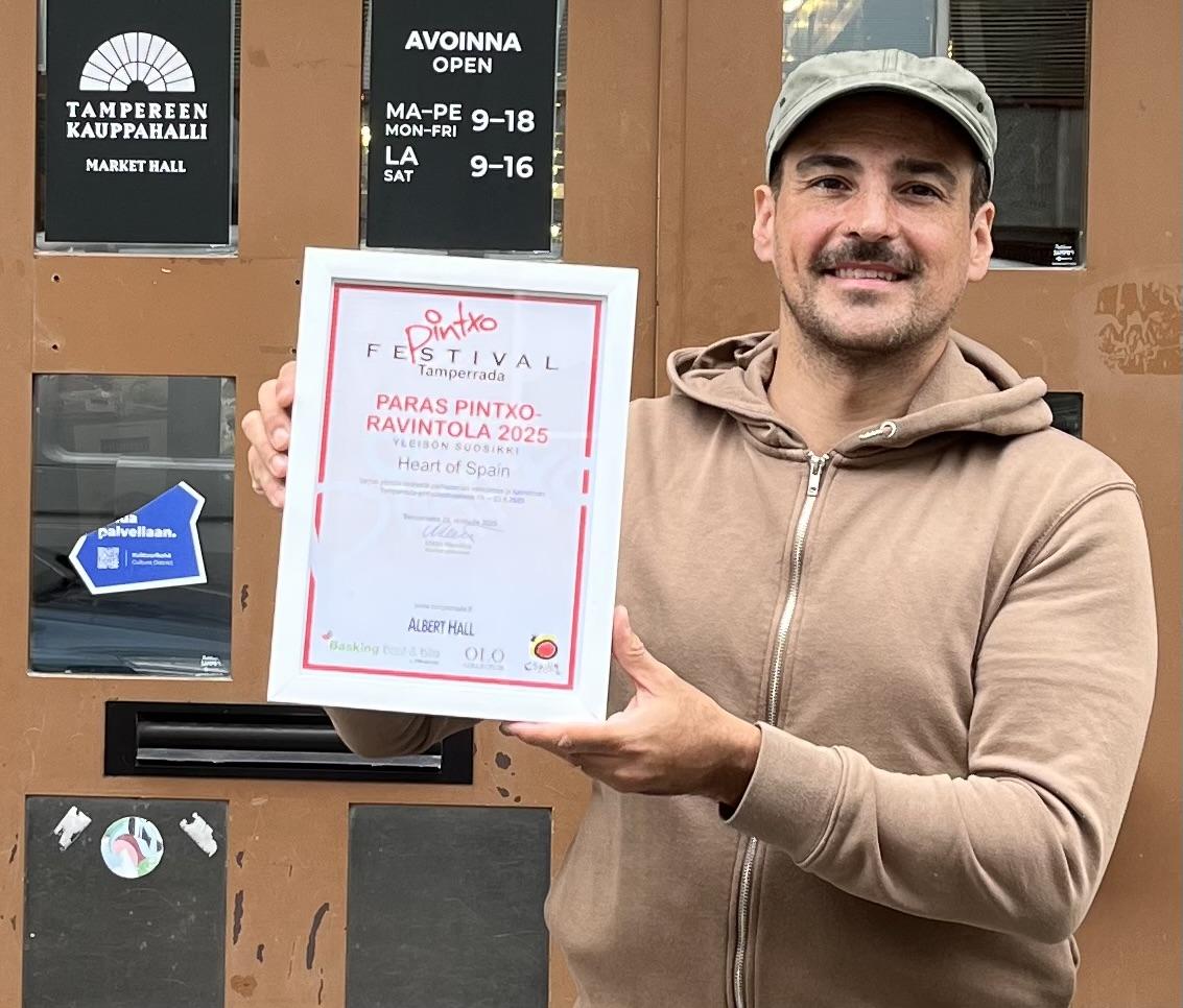 Tänä vuonna yleisö ei äänestänyt yhtä annosta vaan kokonaisvalikoimaa, tunnelmaa ja palvelua. Tampereen Kauppahallissa sijaitseva ravintola-herkkumyymälä Heart of Spain nappasi tänä vuonna yleisön äänet parhaaksi pintxoravintolaksi 2025. Ravintoloitsija Hernán Martin oli panostanut valikoimaan ja pidentänyt aukioloaikoja sopimaan pintxofestivaalin aikatauluun.